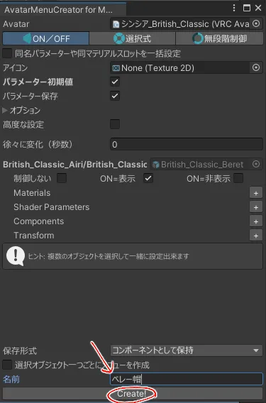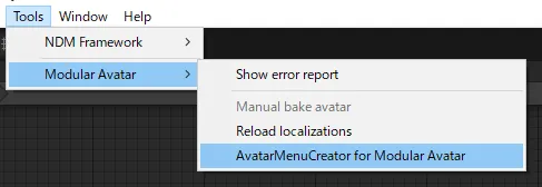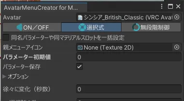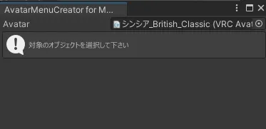 またはメニューから「Tools」→「Modular Avatar」→「AvatarMenuCreator for Modular Avatar」を開いて、ヒエラルキー上のアバターをツールにセット!