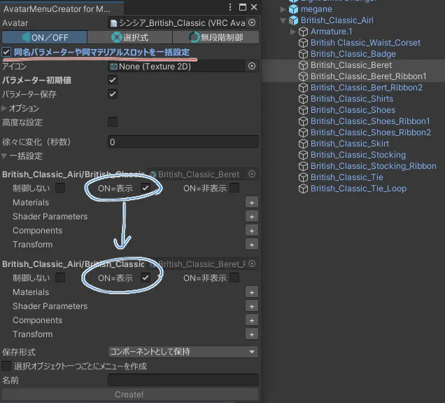 複数のオブジェクトを編集する場合は、「同名パラメーターや同マテリアルスロットを一括設定」をオンにすると便利です。