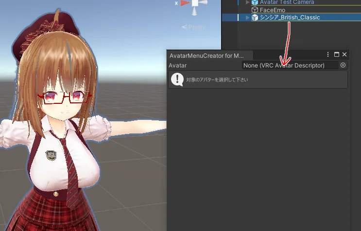 またはメニューから「Tools」→「Modular Avatar」→「AvatarMenuCreator for Modular Avatar」を開いて、ヒエラルキー上のアバターをツールにセット!