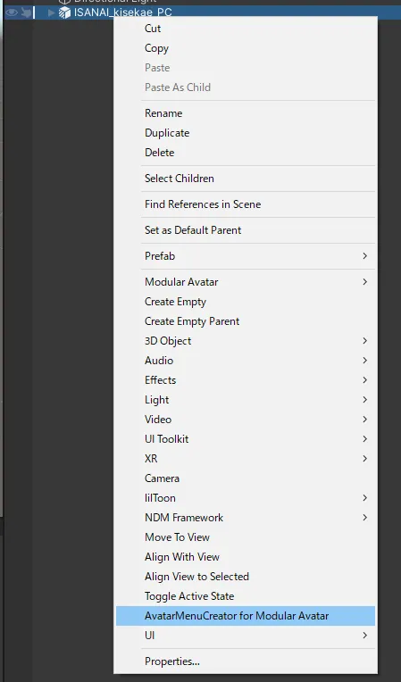 Section titled “①ツールを開く”アバターを右クリックして「AvatarMenuCreator for Modular Avatar」を開きます。