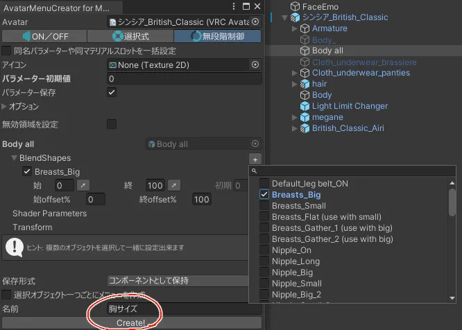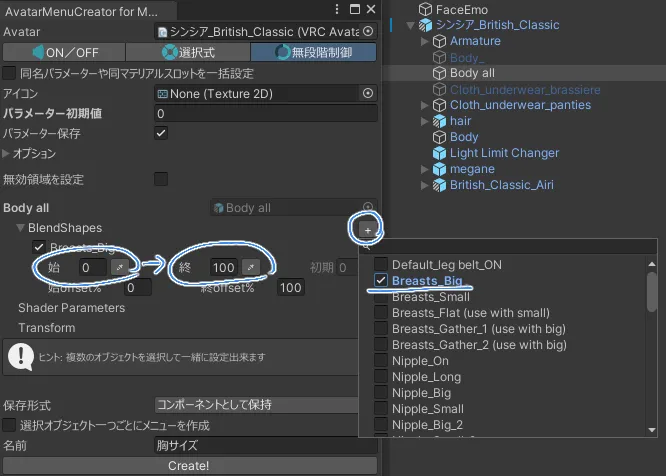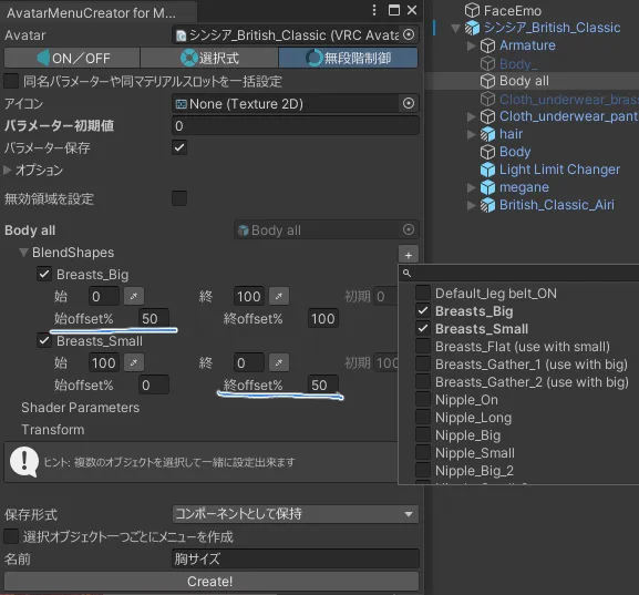 たとえば0~50%まではBreast_Smallを100→0に、50~100%まではBreast_Bigを0→100にする場合、以下のように設定します。