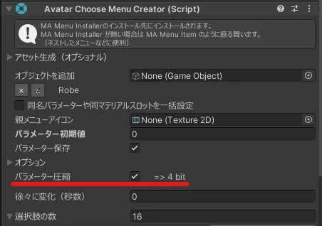 追加ツール Compressed Int Parameters を使うと、選択式メニューではパラメーターの必要bit数が必要最小限に削減できるようになります。