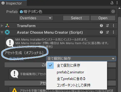 メニューをプレハブにすると、アセット生成機能が使えます。