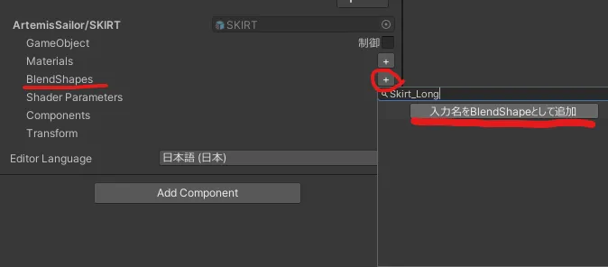 BlendShapeの追加ボタンから開くBlendShape選択ウインドウで、任意の名前を指定してBlendShapeとして追加できます。