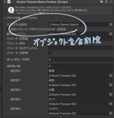 メニューをそのままにする場合、Android用prefab variantの継承先で操作内容のみ削除・変更すると良いと思います。